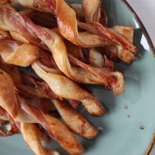 Dan kom je, in mijn geval uit op spek/bacon. Bacon en glutenvrij bladerdeeg. Top combinatie! Helemaal als je er leuke stengels van maakt.