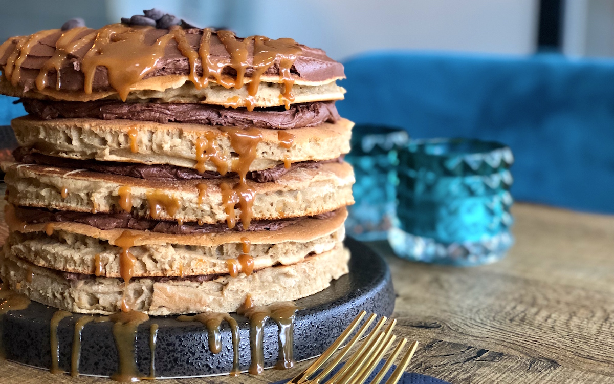- Garneer de Espresso Pancake taart met wat losse chocolade en een beetje karamel en geniet ervan! Snij mini stukken want hij is wel lekker machtig!
