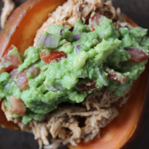 - Snij de aardappel open, leg de kip erop en serveer met guacamole! Eet smakelijk