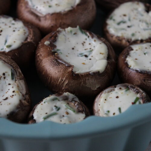 - Schep de roomkaas in de champignons en leg ze in een ovenschaal.